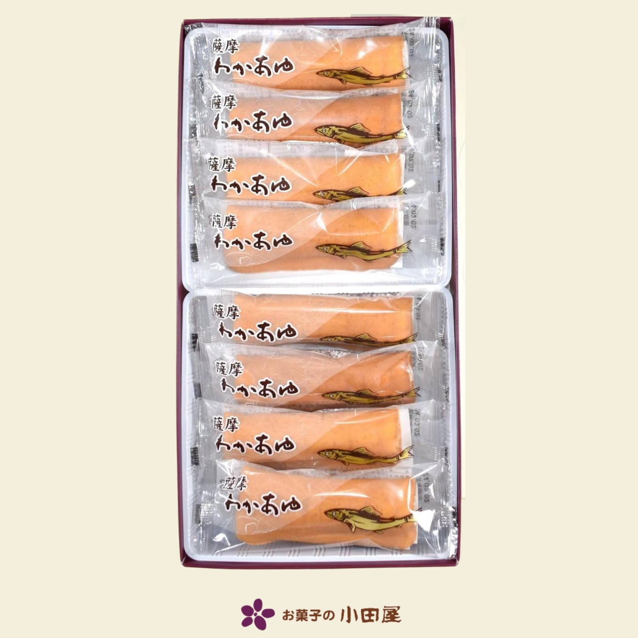 小田屋の人気商品、薩摩わかあゆをご紹介します。甘さ控えめの皮と求肥餅の柔らかさが特徴で、ひと口食べればその食感と美味しさに虜になります。一箱には8個のわかあゆが入っていますので、お友達やご家族と一緒に楽しむこともできます。