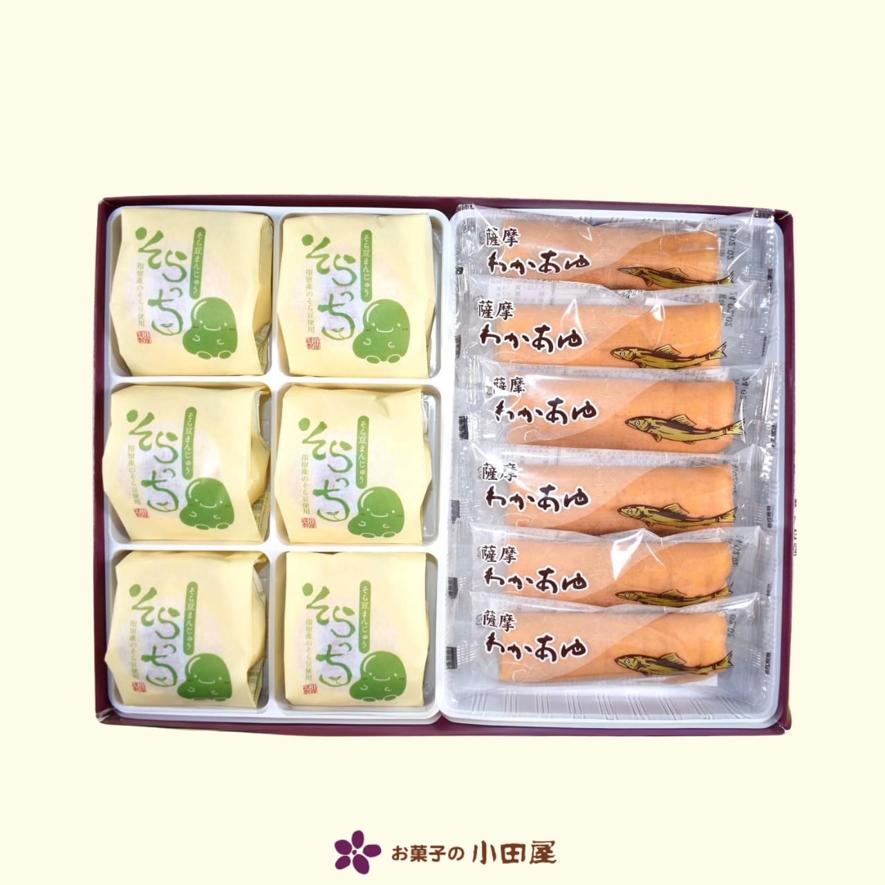 甘さが抑えられた皮と柔らかい求肥餅が絶妙なハーモニーを奏でる、小田屋の人気お菓子「薩摩わかあゆ」6個と、指宿産のそら豆をたっぷり使用した特製餡ともちもち食感が特徴の「そらっち」が6個が入った詰合せ12個セットです。自分へのご褒美や大切な人へのギフトにもぴったりです。